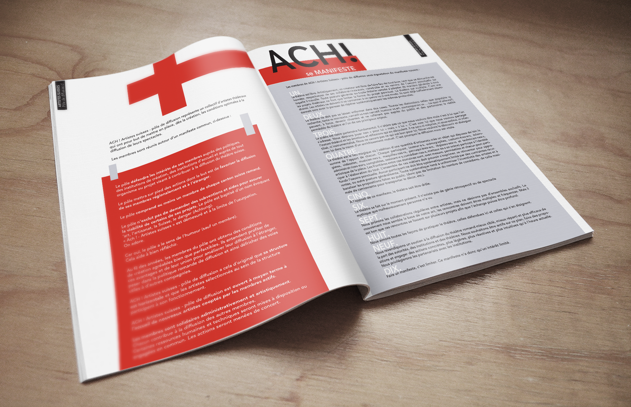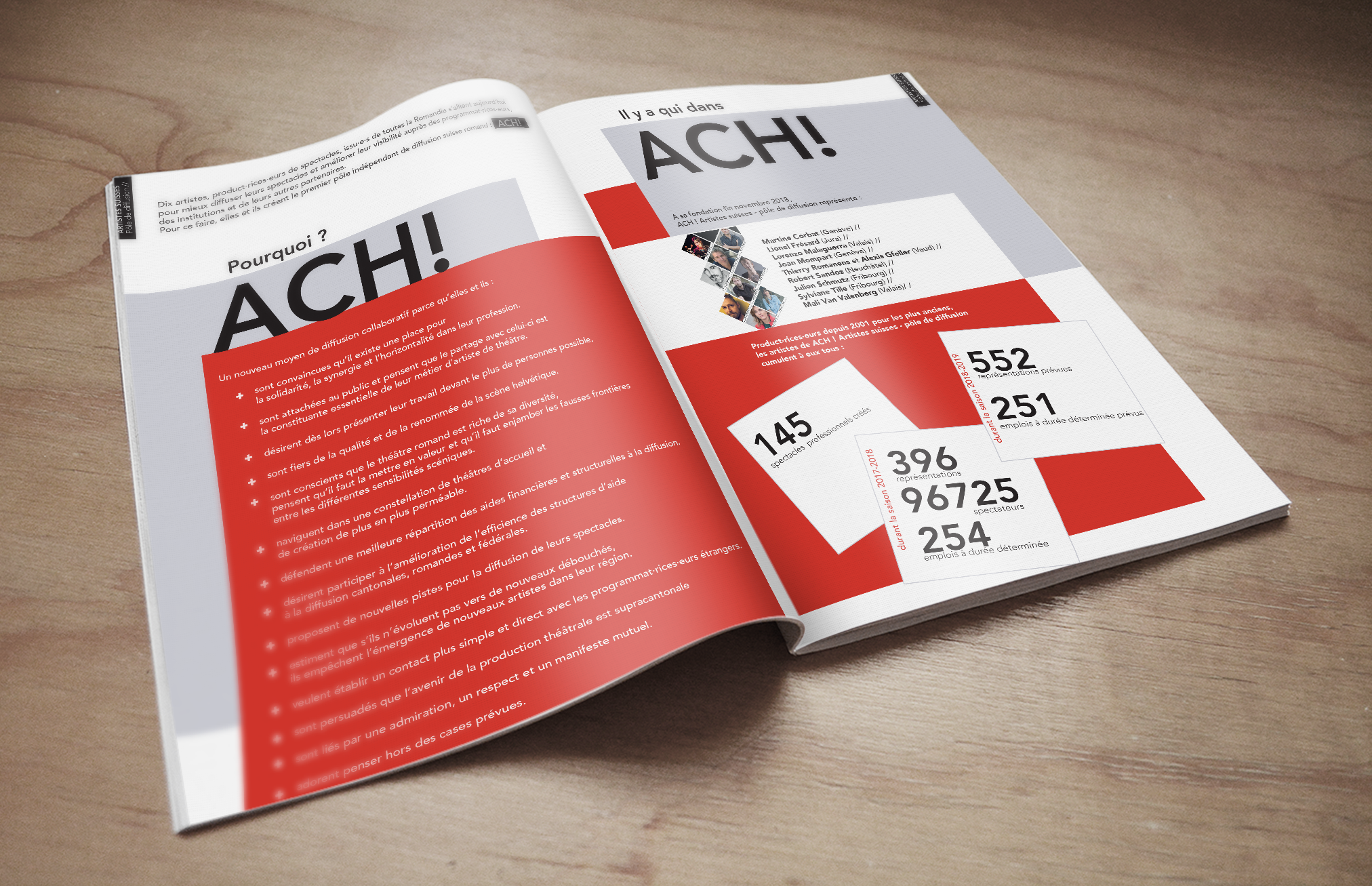 Mise en page d'un dossier de presse pour ACH!, un collectif de producteurs et metteurs en scène suisses.
